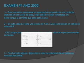 Este documento contiene 35 preguntas y respuestas sobre conceptos eléctricos y electrónicos como conexión en serie y paralelo de pilas, cálculo de tensión, corriente y potencia, frecuencia, tipos de rectificadores, características de diodos, transistores y tiristores. Las preguntas abarcan temas como leyes de Kirchhoff, efecto varicap, permeabilidad magnética, corriente alterna y corriente continua.