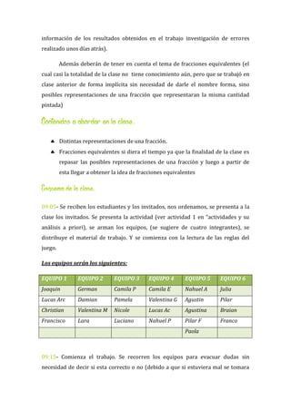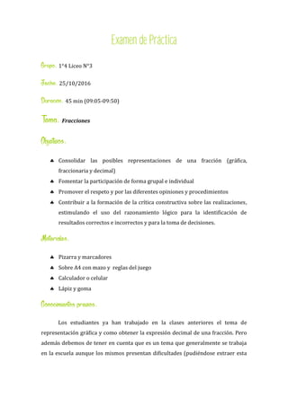 Este documento presenta un plan de clase para enseñar fracciones a estudiantes de 1°4 Liceo N°3. La clase dura 45 minutos y se centra en consolidar las representaciones de fracciones (gráficas, fraccionarias y decimales) a través de un juego grupal llamado "Las Pandillas". Los estudiantes trabajarán en equipos para identificar las diferentes representaciones de números fraccionarios en cartas. Luego se realizará una puesta en común para revisar los resultados.
