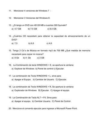 Este documento contiene 20 preguntas de opción múltiple sobre conceptos básicos de computación e informática como sistemas operativos, software, hardware, formatos de almacenamiento y combinaciones de teclas. Las preguntas abarcan temas como Windows, sistemas operativos Android y Linux, programas como Microsoft Visio, Google, fundadores de empresas tecnológicas, formatos de almacenamiento como DVD y CD, y combinaciones de teclas para funciones básicas en Windows.