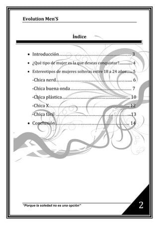 Este documento presenta cinco estereotipos comunes de mujeres solteras entre 18 y 24 años y ofrece consejos sobre cómo conquistar a cada tipo. Los estereotipos incluyen la "chica nerd", la "chica buena onda", la "chica plástica", la "chica X" y la "chica fácil". Para cada una, el documento describe sus características y sugiere tácticas como mostrar interés, dar detalles, invitar a citas divertidas y hablar claramente sobre sentimientos para lograr conquistarlas.