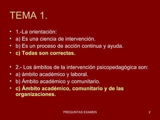 Este documento contiene preguntas de examen sobre diversos temas relacionados con la orientación educativa y la evaluación de programas. Las preguntas cubren temas como la definición de orientación, los ámbitos de intervención psicopedagógica, los modelos de evaluación de necesidades, el diseño y evaluación de programas, y el control y seguimiento de programas.