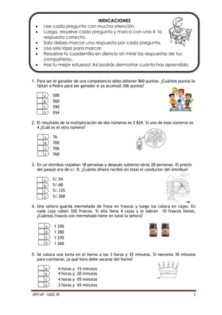 El documento presenta 20 preguntas de matemáticas para un examen de cuarto grado. Las preguntas incluyen cálculos sobre sumas, restas, multiplicaciones, divisiones y problemas de la vida real. El estudiante debe marcar la respuesta correcta para cada pregunta.