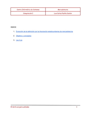 El documento describe la evolución de la definición de mercadotecnia según la Asociación Estadounidense de Mercadotecnia, incluyendo las definiciones de 1985, 2004 y 2007. También explica los objetivos y conceptos clave de la mercadotecnia, así como las 4Ps, que son herramientas utilizadas para implementar estrategias de mercadeo.