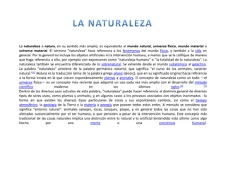 La naturaleza se refiere al mundo físico y a la vida en general, incluyendo plantas, animales y fenómenos naturales como la geología y el clima. El término proviene del latín "natura", que significa el curso natural de los seres vivos. La naturaleza se distingue de lo sobrenatural y de los objetos creados por el ser humano. Incluye desde el mundo subatómico hasta el galáctico y desempeña un papel esencial en sustentar la vida en la Tierra a través