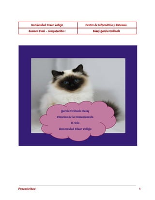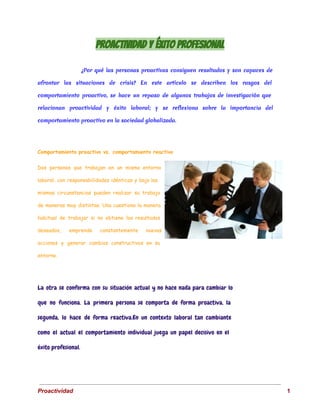Este documento describe la proactividad y su relación con el éxito profesional. Define la proactividad como tomar la iniciativa para crear cambios y oportunidades en lugar de reaccionar pasivamente. Investigaciones muestran que las personas proactivas tienen mejores resultados laborales, liderazgo y rendimiento. Ser proactivo es crucial para tener éxito en entornos cambiantes como el mercado laboral actual.