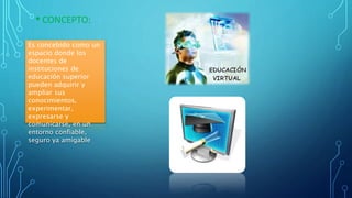 Este documento describe la educación en entornos virtuales. Explica que estos entornos permiten a los docentes adquirir conocimientos de forma flexible y segura. Entre las ventajas se incluyen el acceso desde casa, horarios flexibles y la interacción cultural, mientras que las desventajas son posibles fallas técnicas y limitaciones de velocidad. Los objetivos son mejorar la enseñanza y el aprendizaje, lograr un aprendizaje inmediato y facilitar la evaluación.