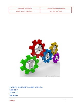 Este documento presenta una introducción a la sinergia, definiendo el término, explicando su historia y dando ejemplos. La sinergia se refiere al efecto adicional que se obtiene cuando dos o más entidades trabajan juntas de forma coordinada, logrando resultados mayores que la suma de sus partes individuales. El documento explora definiciones de sinergia de diferentes autores y teorías y provee aplicaciones y ejemplos como la combustión y la vida celular para ilustrar este concepto.