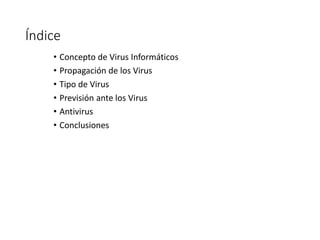 Este documento habla sobre los virus informáticos, describiendo que son programas creados para interferir con las computadoras, dañar o eliminar datos, o propagarse a otras máquinas. Explica que existen diferentes tipos de virus con distintos niveles de gravedad, al igual que los virus humanos, y que nuevas variantes surgen constantemente. También cubre cómo se propagan los virus a través de usuarios desprevenidos y formas más sofisticadas, así como la importancia de la prevención y el uso de antivirus.