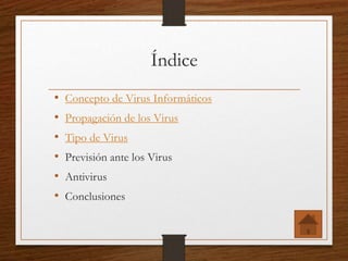 Este documento describe los conceptos básicos de los virus informáticos, incluyendo su definición, tipos de propagación y severidad, así como formas de prevenirlos y usar antivirus. Explica que los virus son programas diseñados para interferir con computadoras o propagarse a otras, que pueden causar daños leves o graves dependiendo del virus, y que nuevas variantes surgen constantemente aunque la precaución y el conocimiento pueden reducir el riesgo de infección.