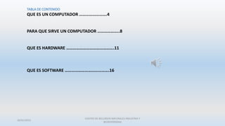 El documento habla sobre los computadores, incluyendo que están compuestos de hardware y software. El hardware se refiere a los componentes físicos como circuitos electrónicos, mientras que el software se refiere a los programas y datos. Los computadores digitales modernos siguen la arquitectura de Von Neumann, con una unidad central de procesamiento, memoria, y dispositivos de entrada y salida conectados por buses.