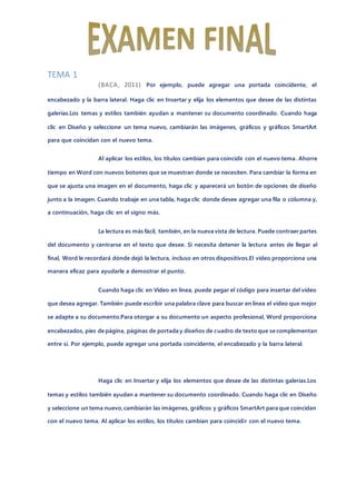 El documento habla sobre las nuevas funciones y herramientas de Microsoft Word para mejorar la presentación y lectura de documentos. Word ofrece temas, estilos, botones e imágenes para dar formato y mantener la coherencia en documentos. También incluye una vista de lectura para enfocarse en el texto y recordar donde se detuvo la lectura. Los videos en línea pueden agregarse para apoyar puntos y Word proporciona encabezados, pies de página y portadas para darle un aspecto profesional a documentos.