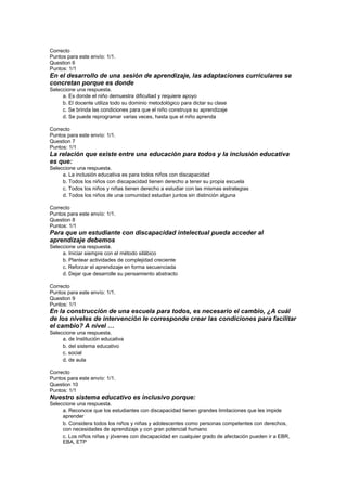 Este examen final evalúa los conocimientos sobre educación inclusiva. Contiene 20 preguntas de selección múltiple sobre temas como la participación del docente en la evaluación psicopedagógica, las adaptaciones curriculares, el trabajo con padres de familia, y las condiciones para la construcción del aprendizaje en el aula para todos los estudiantes.