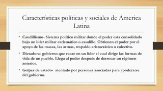 Este documento resume las características políticas y sociales de América Latina después de las guerras de independencia, incluyendo el caudillismo, dictaduras, golpes de estado, oligarquías, y las luchas entre liberales y conservadores. También describe brevemente la situación política en países específicos como Colombia, Ecuador, Perú, Argentina, Chile, Paraguay, México y otros durante este período.
