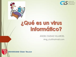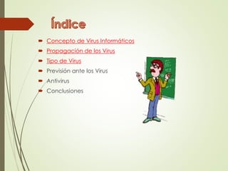 El documento habla sobre los virus informáticos, incluyendo su definición, formas de propagación, tipos, cómo prevenirlos y usar antivirus. Explica que los virus son programas creados para interferir o dañar computadoras y propagarse a otras, y que sus efectos van desde molestos hasta devastadores, dependiendo del virus. También menciona que nuevas variantes surgen diariamente y la importancia de tomar precauciones y usar conocimientos para reducir el impacto de los virus.