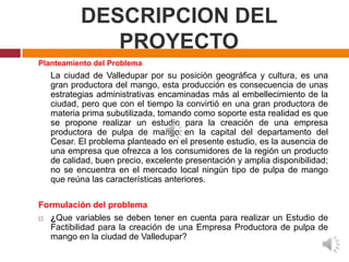 Este documento presenta un estudio de factibilidad para crear una empresa productora de pulpa de mango en Valledupar. El estudio analiza variables como demanda, oferta, precios y proceso productivo para producir pulpa de mango congelada a partir de la abundante producción de mango en la región. El estudio concluye que la creación de esta empresa es factible y puede satisfacer la demanda local de pulpa de mango de manera rentable.