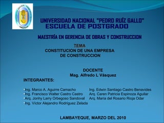 Este documento presenta la constitución de una empresa de construcción llamada "Ingenieros y Arquitectos Asociados S.A.C." en Lambayeque, Perú. La empresa está formada por 6 profesionales de ingeniería y arquitectura. El documento describe los requisitos para constituir legalmente la empresa, como elaborar la minuta, realizar la escritura pública e inscribir la empresa en el registro público. También presenta la misión, visión, objetivos y estrategias de marketing de la nueva empresa de construcción.