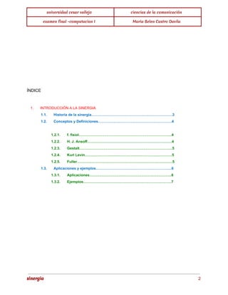 Este documento presenta una introducción a la sinergia. Define la sinergia como el efecto adicional que se obtiene cuando dos o más organismos trabajan juntos de forma conjunta, multiplicando progresivamente sus energías individuales. Incluye las definiciones de sinergia según diferentes autores y teóricos como Ansoff, Gestalt y Fuller. También presenta ejemplos de aplicaciones de la sinergia en campos como la computación, la medicina y las relaciones humanas, así como ejemplos ilustrativos como el fuego y la vida celular.