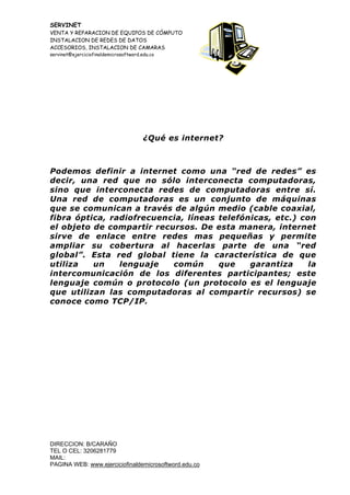 El documento define a Internet como una red de redes que interconecta computadoras y redes de computadoras a través de protocolos comunes como TCP/IP, permitiendo compartir recursos e información entre una amplia red global.
