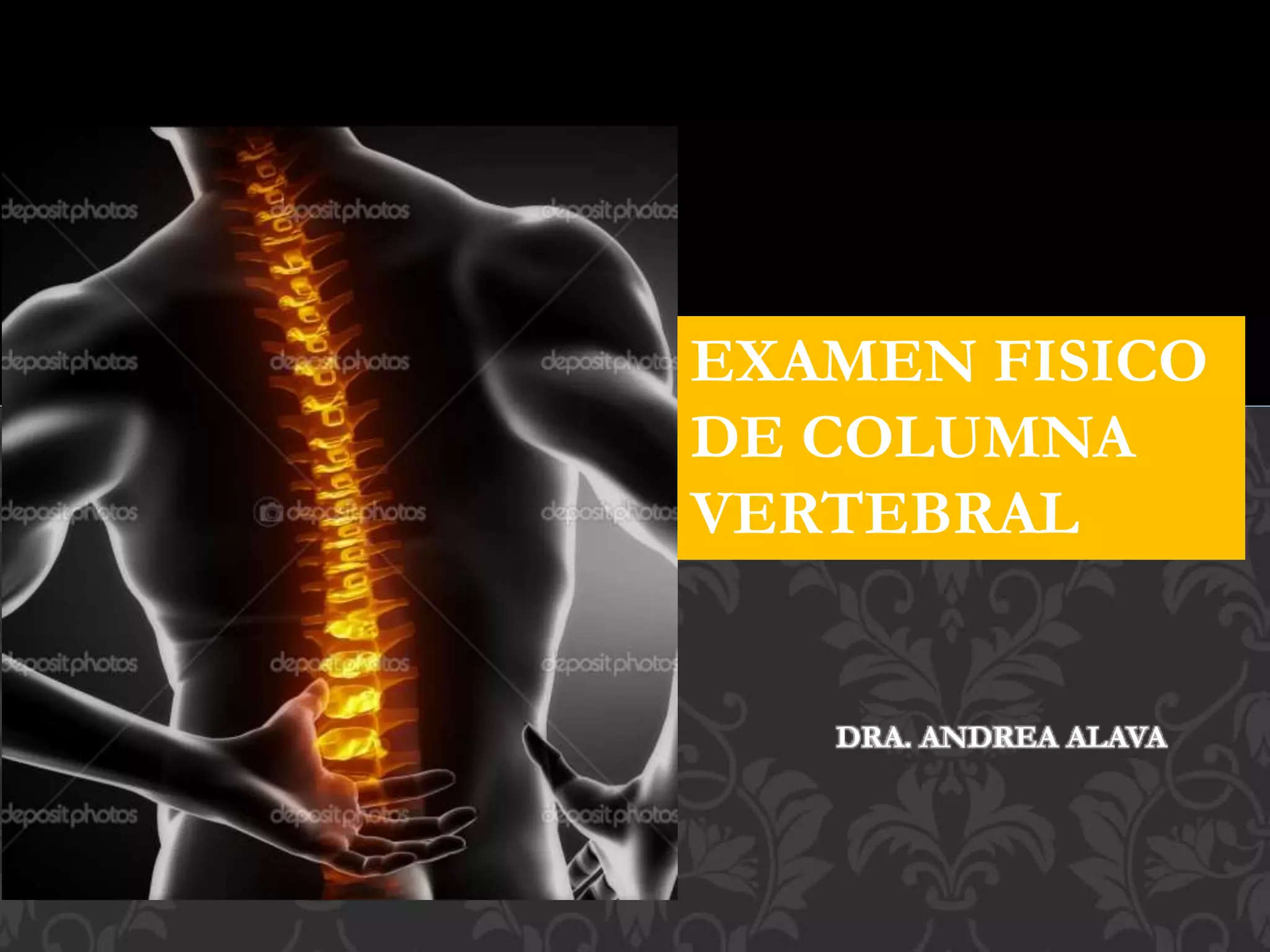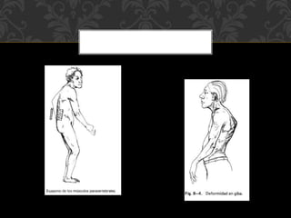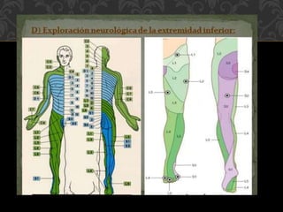 Este documento describe los pasos para realizar un examen físico completo de la columna vertebral, incluyendo la inspección, palpación y pruebas de movilidad de la columna cervical, torácica y lumbar. También detalla las pruebas neurológicas para evaluar la integridad de los nervios espinales. El examen físico es fundamental para diagnosticar cualquier condición que afecte la columna vertebral y la médula espinal.