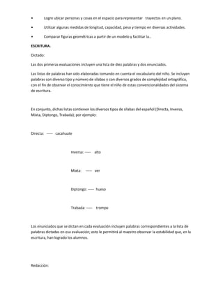 El documento proporciona información sobre las evaluaciones de lectura y escritura para alumnos de segundo grado. Incluye objetivos de aprendizaje, materiales de evaluación como palabras, enunciados y párrafos, y procedimientos para la administración e interpretación de las evaluaciones para diagnosticar el nivel de los estudiantes en estas áreas.