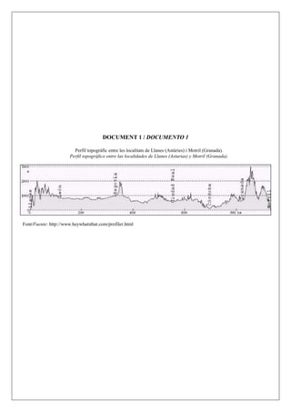 Este documento presenta información sobre un examen de geografía para el acceso a la universidad en España. Incluye un mapa de la península ibérica, un perfil topográfico de la cordillera, y datos sobre el desempleo en España entre 2005-2013 y su distribución provincial en 2013. El examen consta de cuatro preguntas sobre la identificación de ríos, unidades del relieve y rasgos del relieve peninsular usando los mapas y perfil; la evolución diferencial del desempleo entre hombres y mujeres; las diferencias territoriales del desempleo