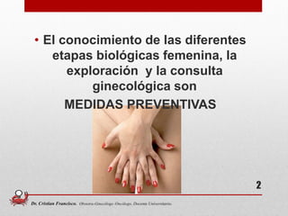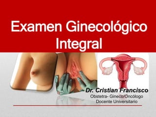 El examen ginecológico integral es una práctica preventiva que permite detectar y prevenir enfermedades y trastornos en el sistema genital femenino, identificando patologías como quistes, infecciones y cáncer. Se realiza en una sola sesión, cubriendo múltiples aspectos de la salud de la mujer a lo largo de las diferentes etapas de su vida. Incluye una serie de exámenes clínicos y citológicos que permiten el diagnóstico oportuno de condiciones médicas.
