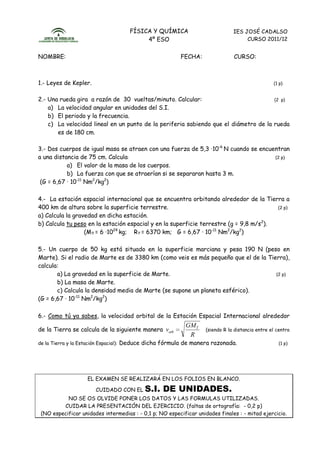 Este documento presenta un examen de física y química para estudiantes de 4o de la escuela secundaria. Contiene 6 problemas que cubren temas como las leyes de Kepler, cinemática de ruedas y sistemas de cuerpos, gravedad en la Tierra, estación espacial internacional y superficie de Marte, y la velocidad orbital de la estación espacial internacional. Los estudiantes deben mostrar su trabajo y usar unidades del SI.