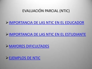 El documento discute la importancia de las tecnologías de la información y la comunicación (TIC) en la educación. Explica que los educadores deben usar las TIC para proporcionar una educación general y preparar a los estudiantes para el futuro, mejorando su calidad de vida. También señala que los estudiantes a menudo conocen las potencialidades tecnológicas fuera de la escuela y que una de las mayores dificultades es que la educación es resistente al cambio. Además, proporciona ejemplos de TIC como la