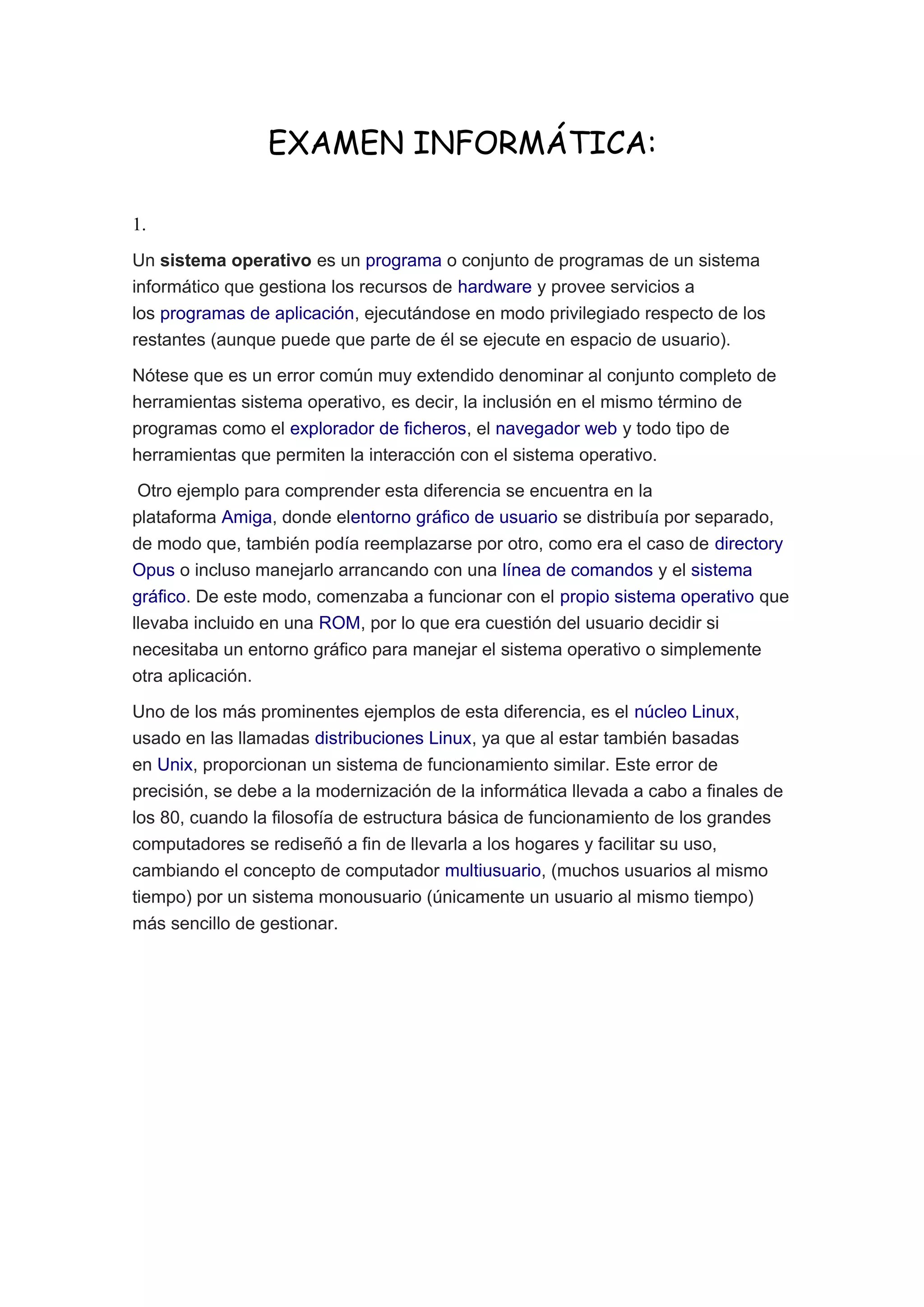 Un sistema operativo es un programa o conjunto de programas que gestiona los recursos del hardware y provee servicios a las aplicaciones. Se ejecuta con privilegios más altos que otras aplicaciones. El documento explica la diferencia entre el sistema operativo y las herramientas como el explorador de archivos. También describe cómo los entornos gráficos pueden instalarse de forma separada, como en las plataformas Amiga. Finalmente, señala que el núcleo Linux es un ejemplo prominente de esta distinción y cómo la informática se modernizó en los años 80 para