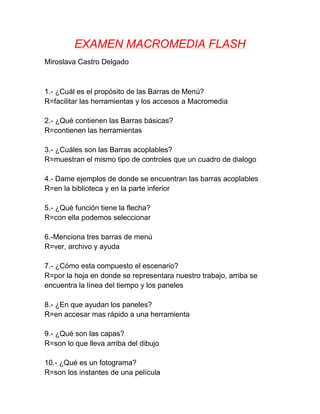 Este documento resume un examen sobre las barras de menú y herramientas en Macromedia Flash. Explica que las barras de menú facilitan el acceso a las herramientas y que las barras básicas contienen las herramientas principales. También describe las barras acoplables, como se encuentran en la biblioteca y parte inferior, y menciona tres barras de menú comunes. Finalmente, resume los componentes del escenario, la función de los paneles, y conceptos como capas y fotogramas.