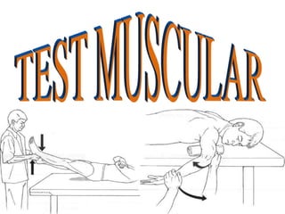 Este documento describe el examen manual muscular (EMM) para evaluar el estado muscular de un paciente. El EMM es un método sencillo que toma entre 15 a 20 minutos y es importante para determinar objetivos y medios terapéuticos. Se debe considerar la posición del paciente y examinador, el origen e inervación del músculo, y aplicar resistencia de forma evolutiva para diagnosticar y pronosticar. Los resultados se anotan en una escala de 0 a 5 donde 0 es ausencia de contracción y 5 es amplitud total con resistencia máxima.