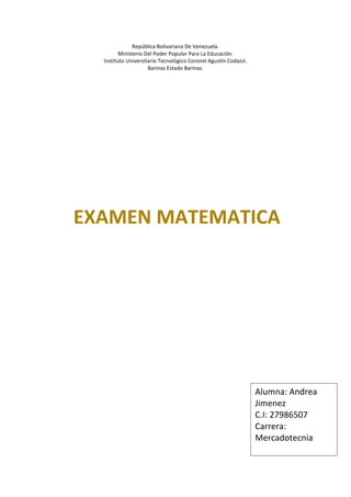 Este documento contiene información sobre una estudiante de la República Bolivariana de Venezuela. Se detalla que Andrea Jiménez, con cédula de identidad 27986507, está estudiando Mercadotecnia en el Instituto Universitario Tecnológico Coronel Agustín Codazzi en el estado de Barinas.