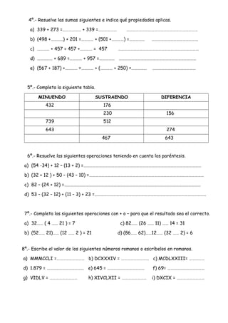 Este documento contiene un conjunto de ejercicios de matemáticas para estudiantes de 4o grado de primaria. Incluye problemas sobre números enteros y decimales, sumas, restas, multiplicaciones, divisiones, paréntesis y números romanos. El estudiante debe completar los ejercicios resumiendo, calculando y escribiendo en números o letras según sea necesario.