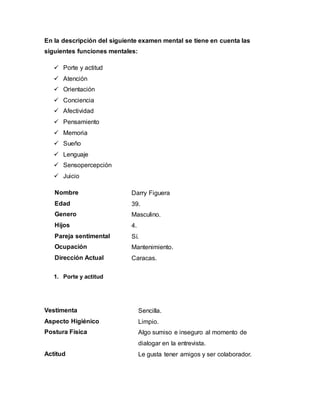 El documento presenta el examen mental de Darry Figuera, un hombre de 39 años. El examen evalúa diferentes funciones mentales como la atención, orientación, afectividad, pensamiento, memoria, sueño, lenguaje y sensopercepción. Darry se muestra algo inseguro pero atento. Está triste porque sus hijos viven lejos, lo que afecta su estado de ánimo y sueño. Su pensamiento gira en torno a sus hijos y usa la música para distraerse. Su memoria es variable y su lenguaje poco fluido