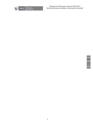 Este documento presenta la prueba nacional clasificatoria para el nombramiento de profesores en educación básica y técnico productiva en Perú en el año 2011. La prueba consta de dos partes: la prueba nacional clasificatoria con preguntas sobre habilidades comunicativas, lógico matemáticas, conocimientos pedagógicos generales y específicos; y la prueba psicológica. El documento incluye las instrucciones para responder la prueba, los índices de las secciones y los tem