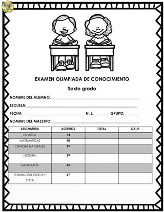 Este documento presenta los resultados de una evaluación aplicada a estudiantes de sexto grado. Incluye la asignatura, el número de aciertos y la calificación obtenida por el estudiante en cada materia evaluada como español, matemáticas, ciencias naturales e historia. También incluye información sobre el nombre del alumno, la escuela, la fecha y las iniciales del maestro que aplicó la evaluación.