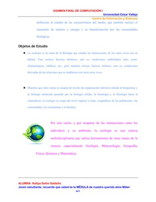 Este documento define la ecología y explica su historia y objetos de estudio. La ecología es la rama de la biología que estudia las interacciones entre organismos y su ambiente, incluyendo factores bióticos como bacterias, plantas y animales, y factores abióticos como agua, nitrógeno y clima. El término "ecología" fue acuñado en 1866 y se refiere al estudio de las relaciones entre organismos y su hábitat. La ecología examina poblaciones, comunidades, ecosistemas y la biosfer