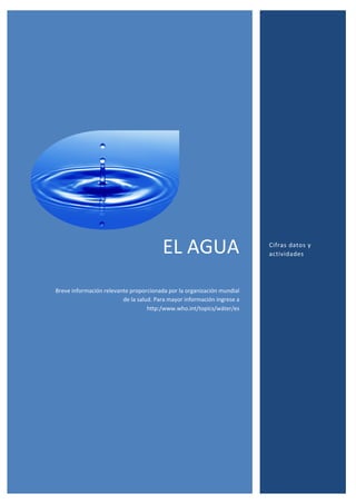 El documento proporciona información sobre la escasez mundial de agua, incluidos datos clave y actividades de la OMS para abordarla. Resume que aproximadamente una de cada tres personas no tiene acceso a agua suficiente, y para 2025 se espera que 2000 millones de personas vivan con escasez absoluta de agua. También destaca las tres prioridades para prevenir enfermedades relacionadas con el agua durante emergencias: asegurar suministros de agua potable, instalaciones sanitarias e higiene.