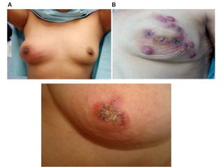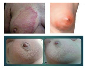 El documento proporciona información sobre el examen de mamas y pelvico. El examen de mamas incluye inspección, palpación de las cuatro cuadrantes de cada mama y exploración del pezón. El examen pelvico incluye inspección estática y dinámica de los genitales externos y espejueloscopia de la vagina. La anamnesis debe incluir antecedentes familiares, hábitos y factores reproductivos.