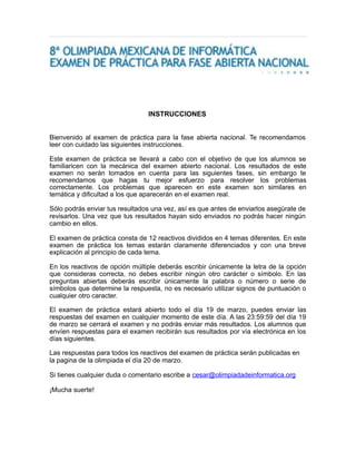 Este documento presenta las instrucciones para un examen de práctica para la fase abierta nacional. Indica que el examen contiene 12 preguntas divididas en 4 temas y que los resultados no afectarán las fases siguientes pero se debe hacer el mejor esfuerzo. También explica los detalles sobre el envío de respuestas y la publicación de soluciones.