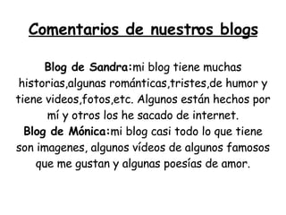 Las estudiantes Sandra y Mónica describen sus blogs escolares. El blog de Sandra contiene varios tipos de historias escritas por ella misma y contenido descargado de Internet, incluyendo fotos y videos. El blog de Mónica se centra principalmente en imágenes y videos de celebridades que le gustan, así como algunas poesías de amor.