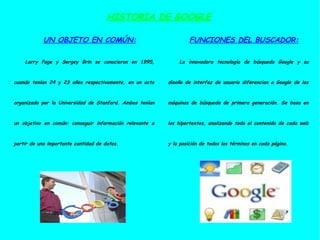 Larry Page y Sergey Brin se conocieron en la Universidad de Stanford en 1995 y compartían el objetivo de encontrar información relevante a partir de grandes cantidades de datos. En 1998 fundaron Google Inc. para comercializar su motor de búsqueda innovador, que analizaba el contenido y estructura de las páginas web de manera diferente a los buscadores anteriores. Más tarde lanzaron servicios especializados como Google Imágenes, Grupos, Noticias y Directorio.