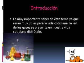 Este documento presenta la Ley de los Gases, incluyendo su importancia, tareas relacionadas como formular conceptos y realizar experimentos, el proceso para completar las tareas visitando páginas web y realizando un mapa conceptual y experimento, recursos como páginas para diferentes tareas, y la evaluación basada en informes, experimentos y criticidad.
