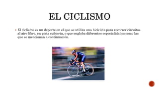 Este documento describe diferentes modalidades del ciclismo como el cross country (XC), downhill y BMX. XC involucra recorrer circuitos al aire libre o en pista cubierta lo más rápido posible. Downhill consiste en descender cuestas abajo pasando obstáculos a alta velocidad. BMX se originó en California y es un deporte extremo que requiere equipo de seguridad como casco y rodilleras.