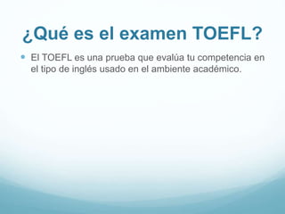 El examen TOEFL evalúa la competencia en inglés académico a través de cuatro secciones: comprensión lectora, comprensión oral, expresión oral y expresión escrita. La comprensión lectora incluye tres pasajes y preguntas, mientras que la expresión oral y escrita requieren tareas que combinan habilidades de lectura y escucha. Para más información, se puede visitar eprepz.com.