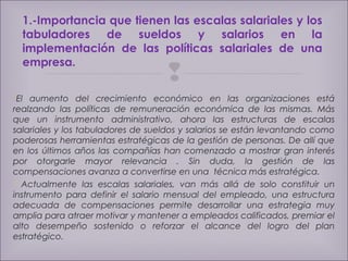 El documento describe la importancia de las escalas salariales y tabuladores de sueldos para las políticas salariales de una empresa. También recomienda que la Dirección General Sectorial del Estado Lara implemente evaluaciones de desempeño y políticas de remuneración monetaria y no monetaria para motivar a los empleados y mejorar la productividad.