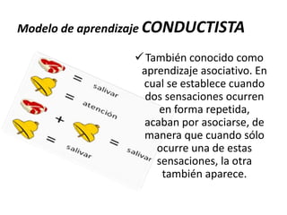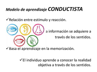 Este documento describe tres modelos de aprendizaje: conductista, cognitivista y constructivista. El modelo conductista se basa en la relación entre estímulo y reacción y en la memorización. El modelo cognitivista enfatiza la construcción gradual del conocimiento a través del razonamiento. El modelo constructivista se centra en que los estudiantes construyen el significado basándose en sus experiencias y conocimientos previos.