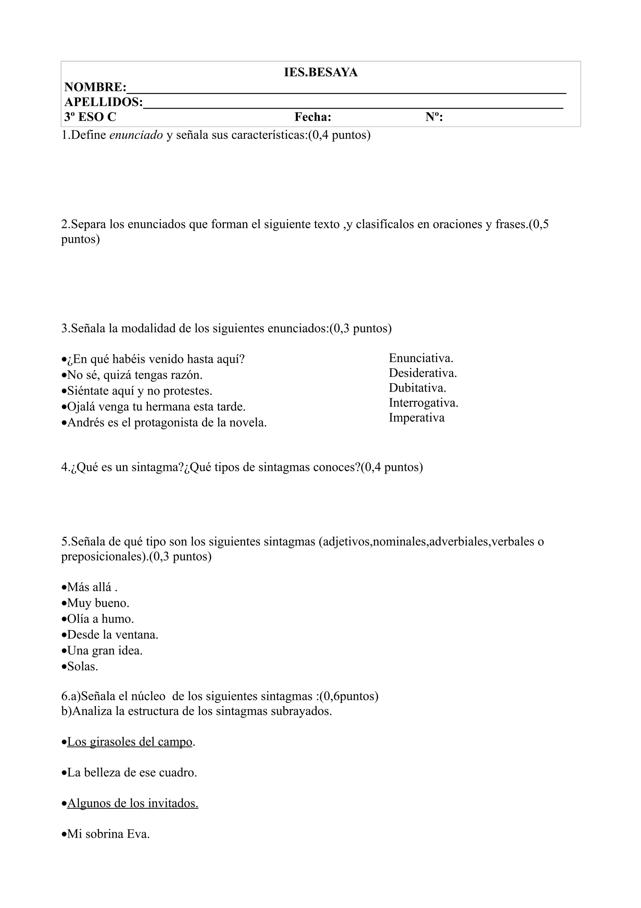 Este documento contiene 6 preguntas sobre gramática española. La primera pregunta pide definir un enunciado y señalar sus características. La segunda pregunta pide separar los enunciados de un texto en oraciones y frases. La tercera pregunta pide identificar la modalidad de diferentes enunciados. La cuarta pregunta pide definir qué es un sintagma y nombrar tipos de sintagmas. La quinta pregunta pide identificar el tipo de diferentes sintagmas. Y la sexta y última pregunta pide identificar