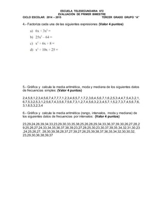 Este documento presenta una evaluación de matemáticas y ciencias para el primer bimestre del tercer grado. La evaluación de matemáticas contiene 6 preguntas que cubren temas como geometría, álgebra, estadística y probabilidad. La evaluación de ciencias contiene preguntas sobre propiedades de la materia, métodos de separación de mezclas y problemas químicos.