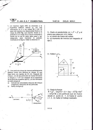 2. Se pide calcular distancias, velocidades, ángulos y fuerzas en situaciones que involucran partículas en movimiento, choques elásticos, sistemas en equilibrio y momentos de inercia.